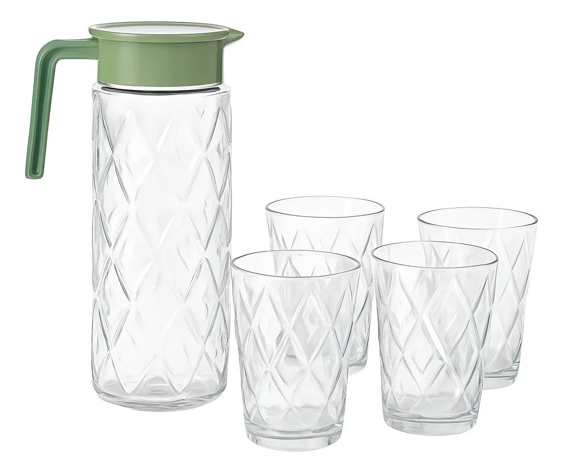 Elevate your serving experience with this Glass Pitcher and Tumbler Set featuring a beautiful carved design. Perfect for serving water, juice, lemonade, iced tea, or any cold beverage, this elegant drinkware set adds a touch of class to any table. The 1-liter glass pitcher comes with a durable green lid and handle for easy, safe, and comfortable pouring.