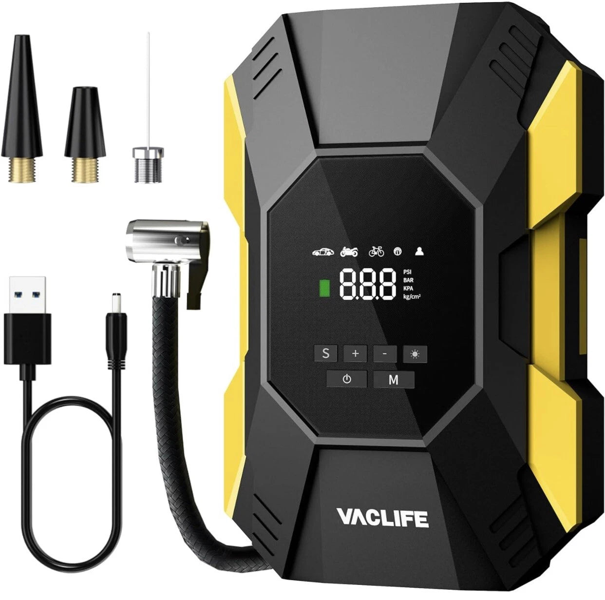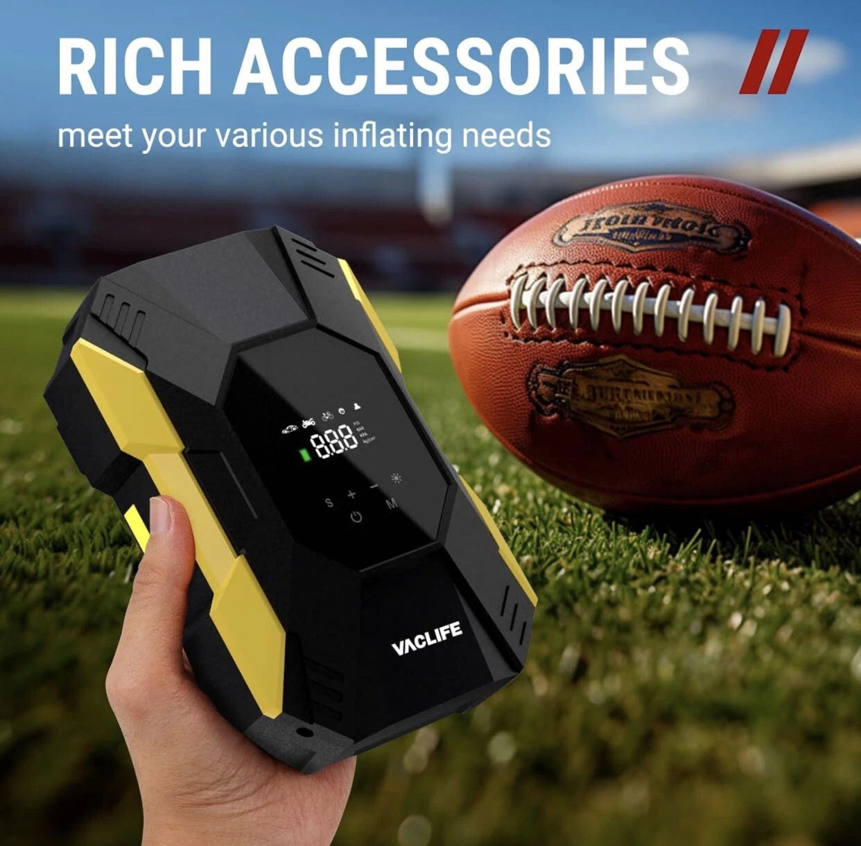 MULTIPLE ATTACHMENTS: VacLife cordless tire inflator is a must-have for drivers, cyclists, and adventurers. With rich accessories included, this portable air pump can not only inflate car tires with width ≤ 245mm and pressure ≤ 50psi, but also refill tires of bikes, motorcycles, balls, and other inflatables!