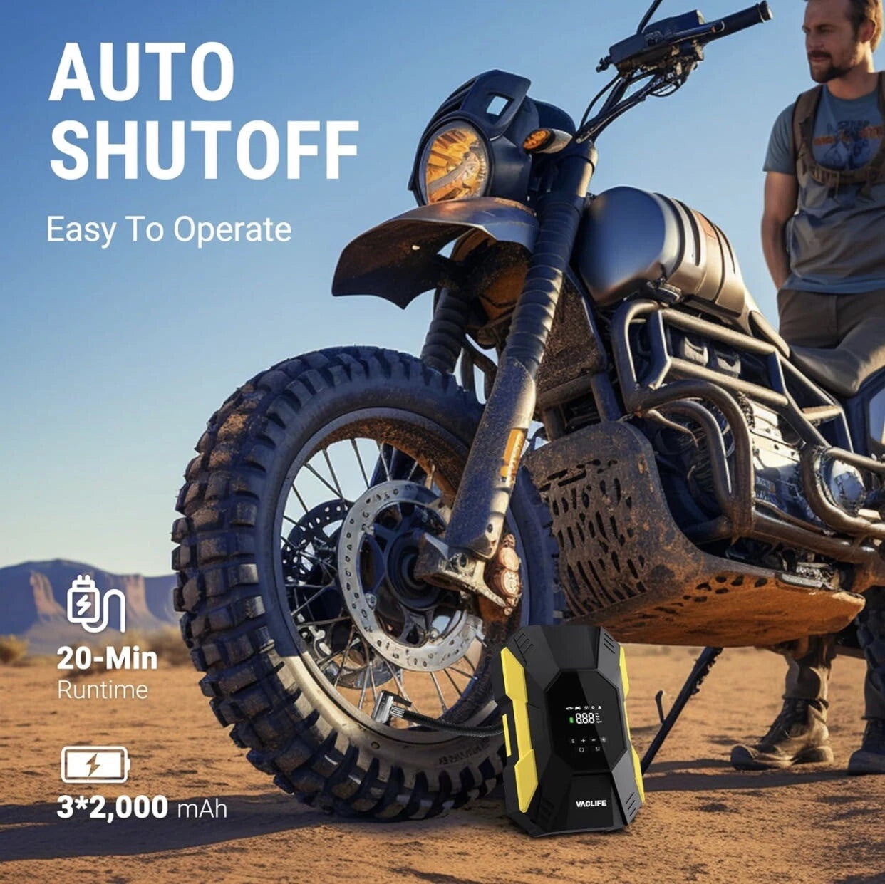 FAST INFLATING: VacLife air compressor with portable design is a great solution for emergencies on the way. It can provide up to 150 psi pressure and refill a 195/55/R15 car tire from 0 to 35 psi less in than 6 mins. Besides, the auto-shutoff design also prevents over-inflating, making it safe to use.